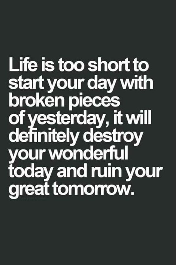 "Life is too short to start your day with broken pieces of yesterday, it will definitely destroy your wonderful today and ruin your great tomorrow." — Unknown