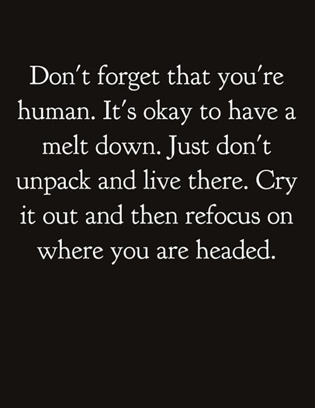 "Don't forget that you're human. It's okay to have a melt down. Just don't unpack and live there. Cry it out and then refocus on where you are headed." —​ Unknown