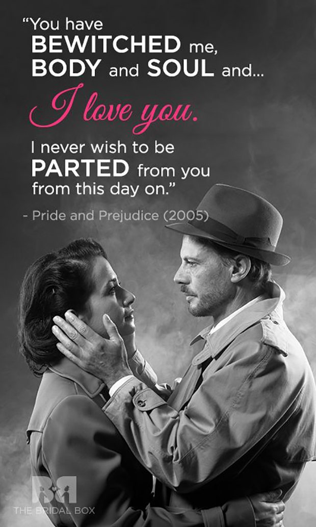 "You have bewitched me, body and soul and... I love you. I never wish to be parted from you from this day on." — Mr. Darcy, Pride and Prejudice