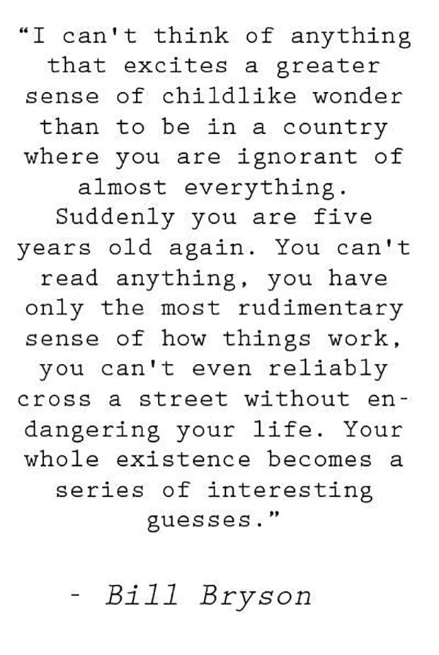 "I can't think of anything that excites a greater sense of childlike wonder than to be in a country where you are ignorant of almost everything. Suddenly you are five years old again. You can't read anything, you have only the most rudimentary sense of how things work, you can't even reliably cross a street without endangering your life. Your whole existence becomes a series of interesting guesses."— Bill Bryson