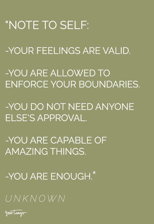 "Note to self. Your feelings are valid. You are allowed to enforce your boundaries. You do not need anyone else's approval. You are capable of amazing things. You are enough." — Unknown