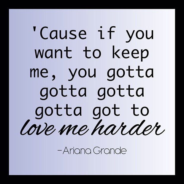 "'Cause if you want to keep me, you gotta gotta gotta gotta got to love me harder." — Love Me Harder