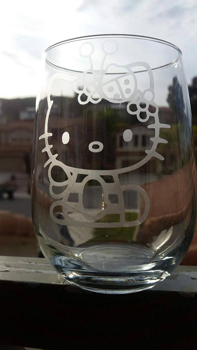 This is a hand etched Hello Kitty bumble bee-inspired stemless wine glass. It's a chemical etch, which means that no matter how many times you wash it, it will never fade. The glass is heat treated and dishwasher safe.