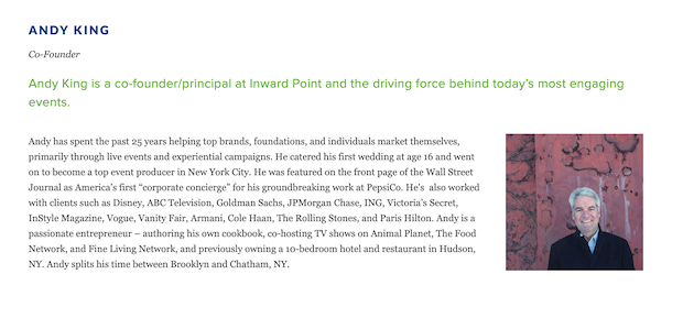 He is currently the co-founder of Inward Point, the company he founded six years ago to produce sustainable, zero-waste events, since 2013.