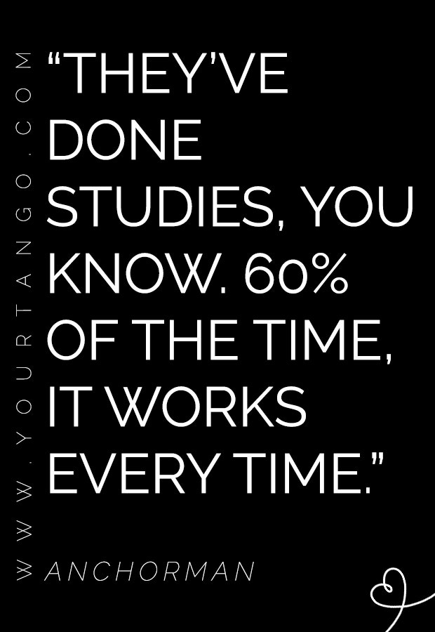 “They’ve done studies, you know. 60% of the time, it works every time.” — Anchorman