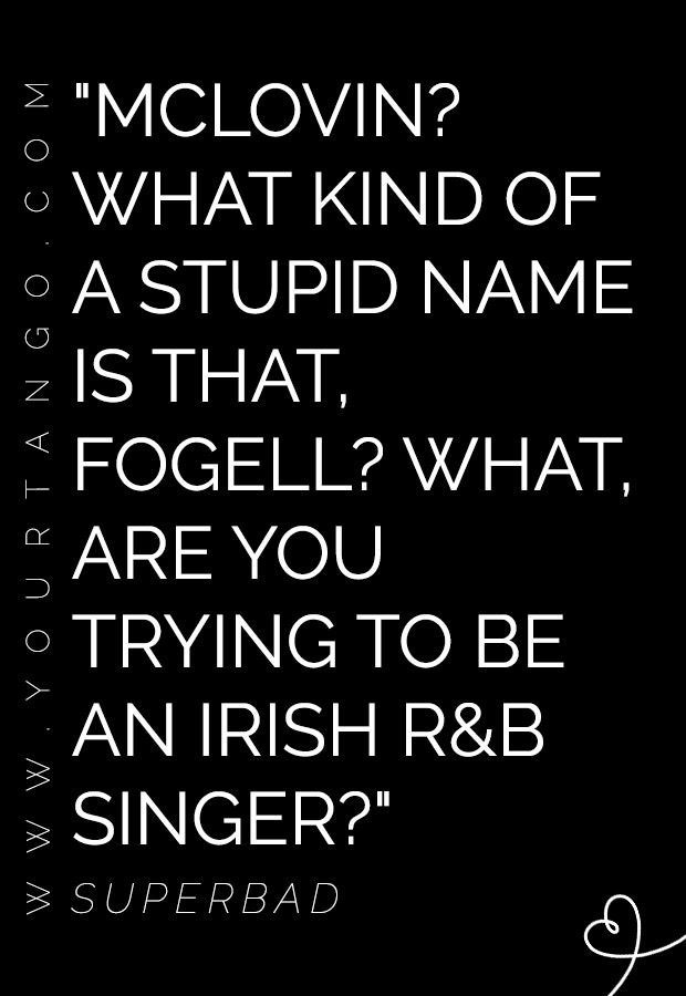 "McLovin? What kind of a stupid name is that, Fogell? What, are you trying to be an Irish R&B singer?" — Superbad