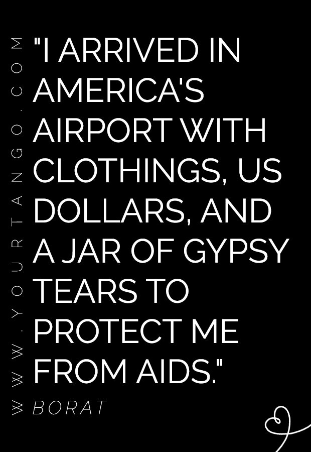 "I arrived in America's airport with clothings, US dollars, and a jar of gypsy tears to protect me from AIDS." — Borat