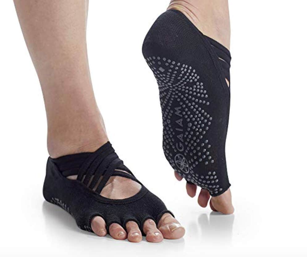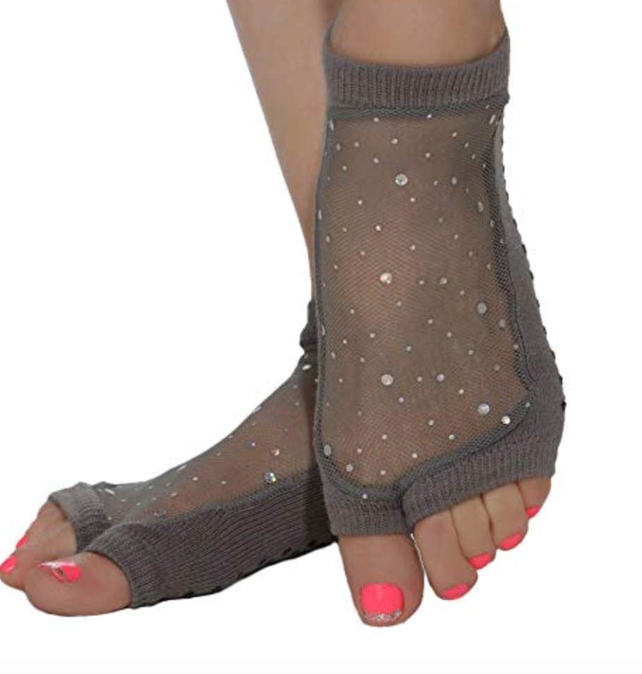 Add a little flare to your practice with these sheer, glitter socks you can have delivered right to your door. The open mesh helps prevent your feet from getting overly sweaty during a hot practice, and open toes keep the socks breathable.