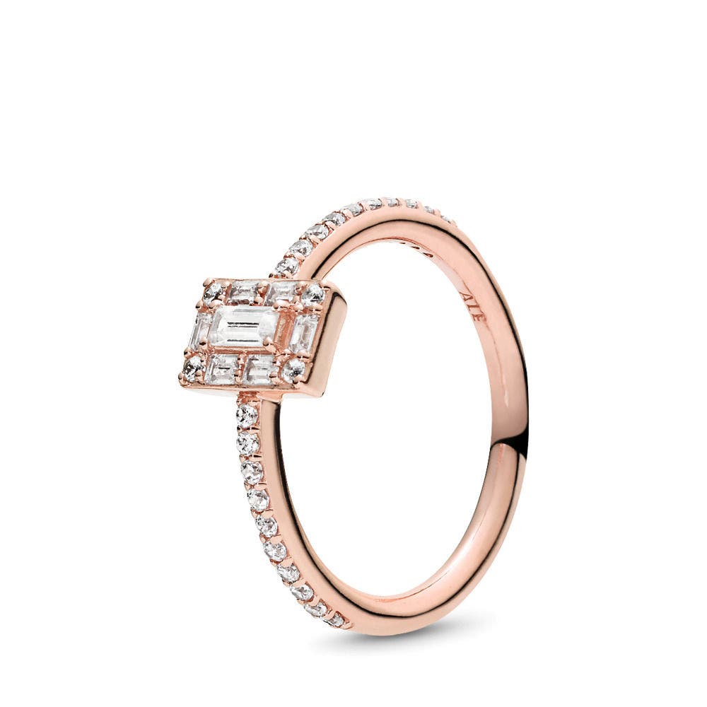 This classic ring in blush-pink is detailed with a baguette-cut center stone surrounded by a halo of smaller stones. It's an absolutely gorgeous way to prove your love and commitment.