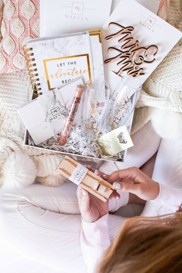 This new luxury bridal subscription box sends brides-to-be stunning gifts and inspiration each month, from beautiful accessories and makeup to marble “Mr. and Mrs.” coasters, to rose gold “Bride” tumblers. Gift-givers can give the Maeven Intro Box, which includes a keepsake box, champagne flutes, cake toppers, rose quartz necklace, bath salts, and a bottle opener.