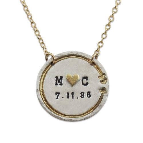 This piece can be personalized with initials and the engagement date. The fine silver Lovestruck Necklace measures approximately 1 inch in diameter and is accented in 22kt gold. The edges of the piece are also lightly hammered for effect, and you can select either a 14kt gold fill chain or a sterling silver chain.