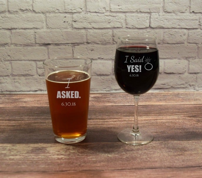 Let your loved ones share how this engagement went down with this special glass set. A beautifully engraved wine and beer glass set will make the perfect gift to those special people in your life. What better way to leave a lasting impression than to give them something personal and from the heart?