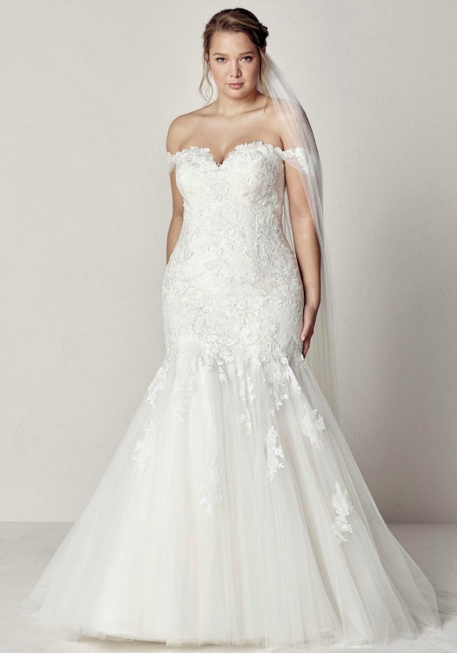 This slim-flare plus-size wedding dress is fashioned in lace, with an off-the-shoulder sweetheart neckline and illusion long sleeves. The scalloped hem extends in a chapel train, trailing beneath the button-trimmed back.