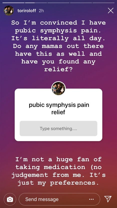 Tori took to Instagram to ask her followers for help, posting on her Story, “So I’m convinced I have pubic symphysis pain. It’s literally all day. Do any mamas out there have this as well and have you found any relief? I’m not a huge fan of taking medication. (No judgment from me, it’s just my preferences.)”