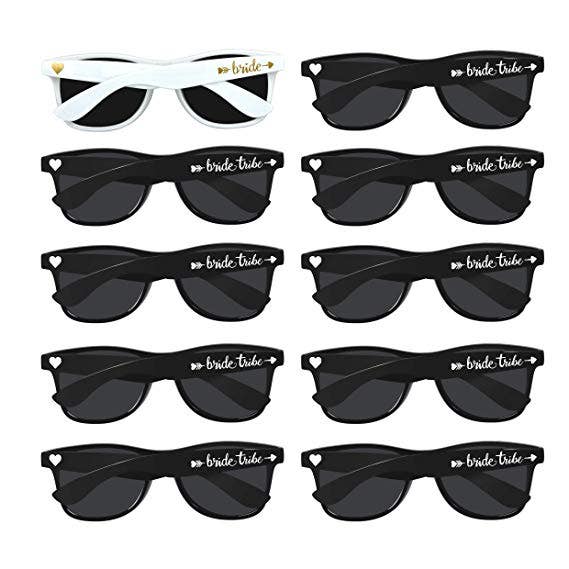This bachelorette party supplies kit contains a total of 1 pair of white 'Bride' sunglasses and 9 pairs of black 'Bride Tribe' sunglasses.