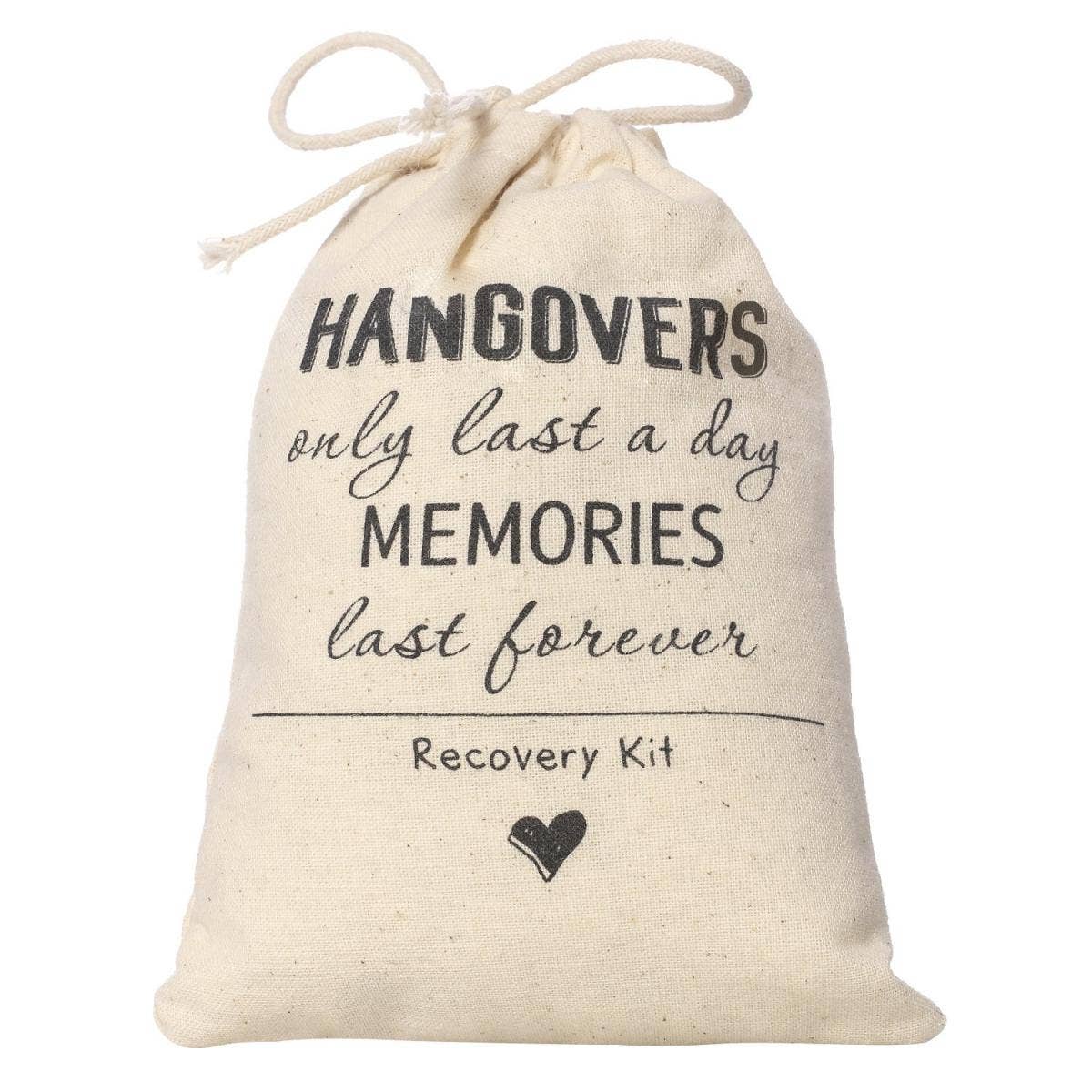 These hangover kit bags are perfect for bachelorette parties and wedding favors. It's made of natural muslin, has a drawstring closure and is stamped with black “hangover” message.