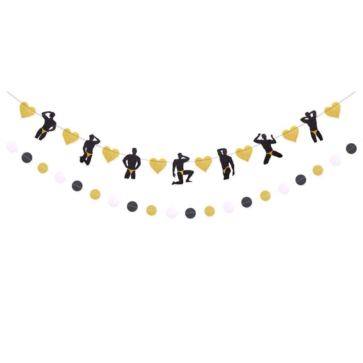 You’ll get 2 stripper banners, one dancer banner and one circle dots garland. The dancer banner is around 63," and the circle dots garland is around 79".