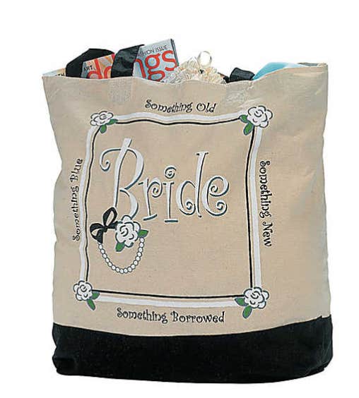Why should bridesmaids have all the tote fun? This beautiful, retro-rustic tote bag will add an extra touch of awesome to your bridal get-together. The accents around the frame say, “Something Old, Something New, Something Borrowed, Something Blue.”