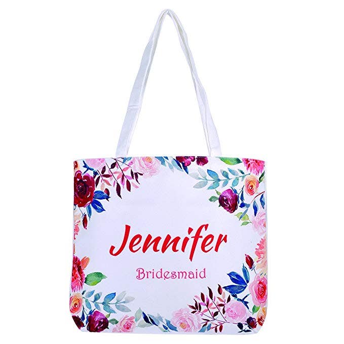 Finding customizable totes that carry a lot of color can be seriously hard, but thankfully, this tote is available for your bridesmaids to enjoy. This affordable tote comes with a personalization option, a breathtaking floral motif, and enough room to make everything fit perfectly.