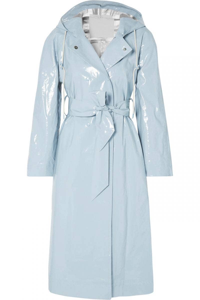 Made from a coated cotton-blend that's waterproof, making it perfect for any destination, this pale blue trench is belted at the waist and has a protective drawstring hood.