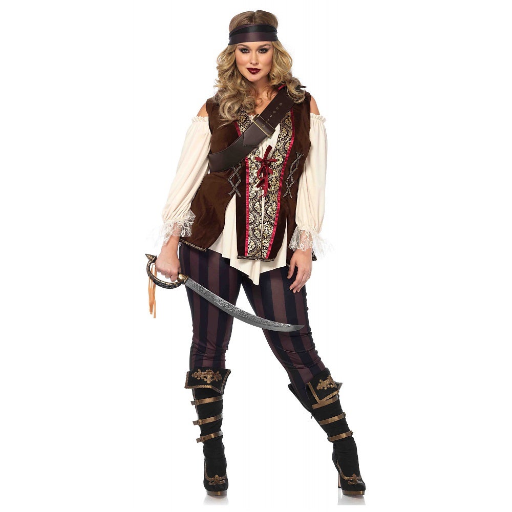 Flattering cold shoulder tunic shirt with attached vest features gold brocade trim. Easy to wear and perfectly comfy leggings have stripes on the front, but are a more flattering solid black on the back. Oversized cross body buckle strap and headband complete your pirate look.
