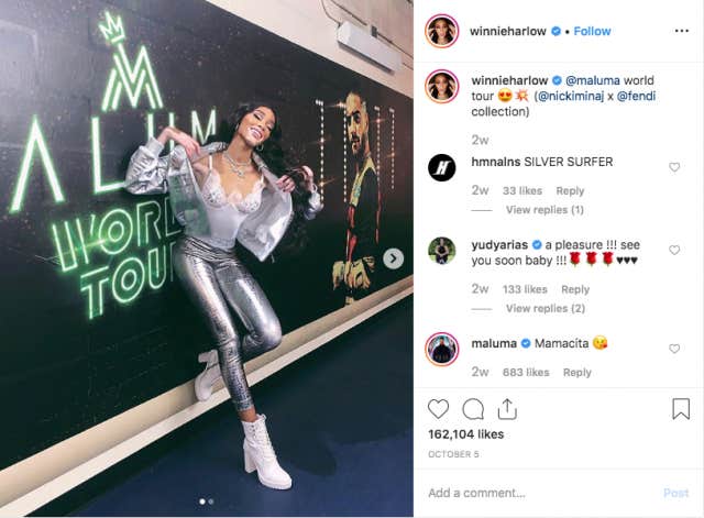 Harlow has also made posts of her own, posing in one photo with an outfit from the Nicki Minaj x Fendi capsule collection, which Maluma commented, “Okkkk.” In another post, he commented “Mamacita” with heart eyes.