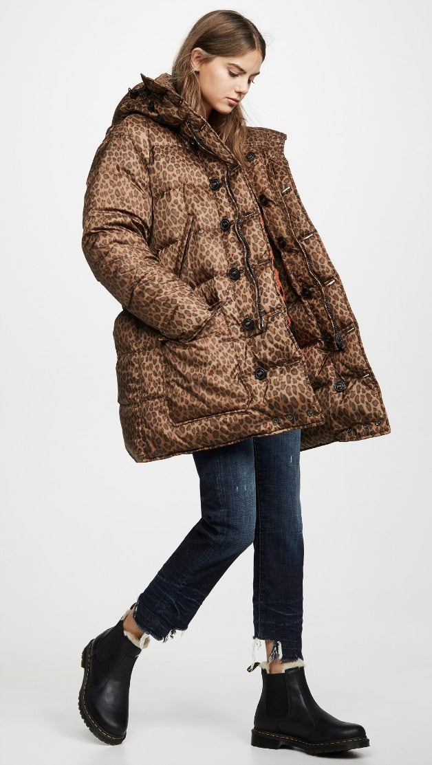 This parka has leopard print, drawstring closure at hood, and interior straps with buckles. It's filled with goose down and feathers for a warm feel.
