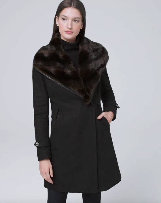 A wool-infused coat with a plush, faux fur collar offers an elevated approach to a cold-weather essential.