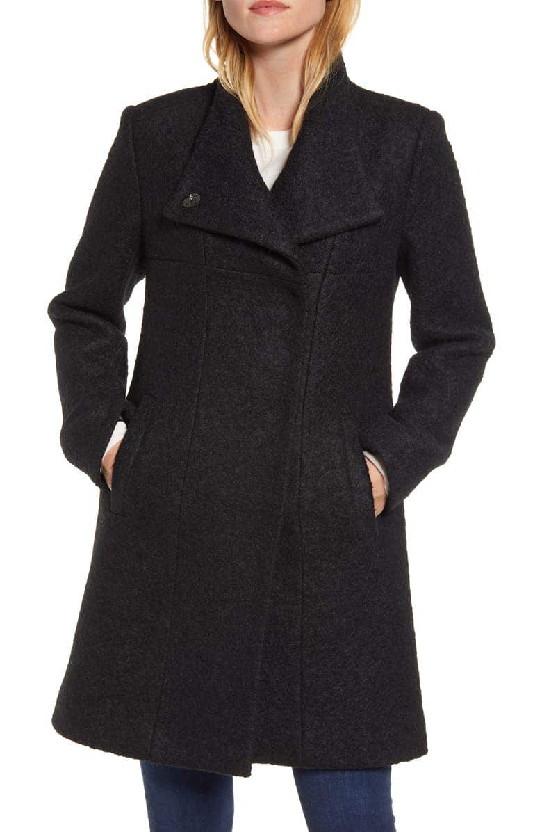 A warm coat for the wintry commute is tailored from a nubby wool-blend bouclé with a funnel-neck and asymmetrical front.