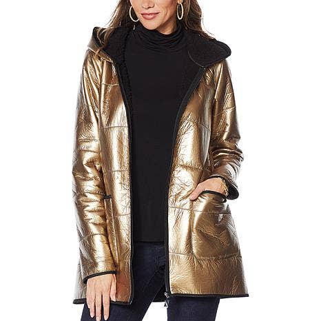 Zip-close pockets with 652 fill power down insulation. Omni-Heat thermal with removable faux fur hood also has 2-way centerfront zipper.
