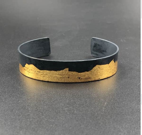 Made from oxidized sterling silver and 24 karat gold, this bracelet is 2.25" across at its widest and is handmade in Minnesota, USA.