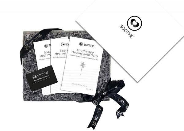 Soothe offers a Gift Set that combines a Massage Card to extend the calming and restorative effects of massage therapy — with luxurious new Sootherapy Healing Bath Salts. These salts contain all-natural, non-GMO, tropical ingredients such as: exotic Moloka’i & ‘Alaea salts, taro, noni, ginger, raw cane sugar, organic coconut oil and coconut milk, which leave skin incredibly soft, hydrated and nourished, and deliciously fragrant.