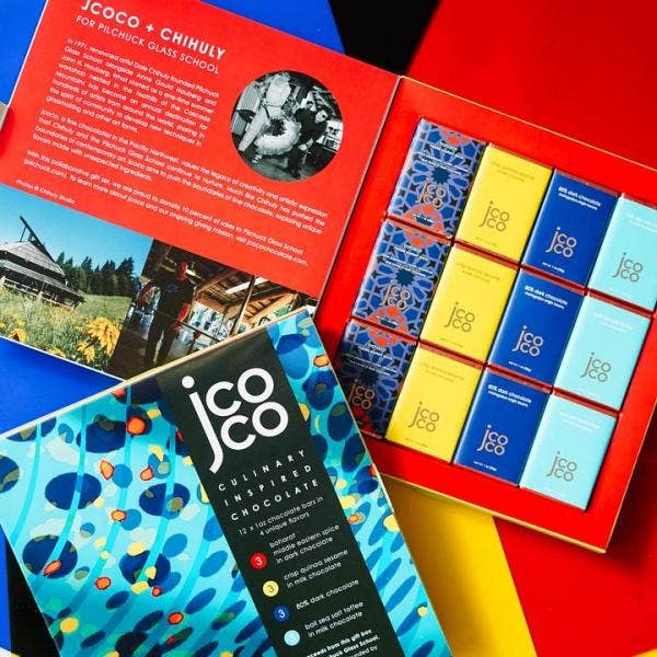 Go above and beyond the traditional box of chocolates by giving her a beautifully designed boxed gift set from jcoco, Seattle Chocolate's unapologetically bold sister brand. The CHIHULY Chocolate Gift Set features four of jcoco’s signature flavors (Boharat Middle Eastern Spice, Crisp Quinoa Sesame, 80 percent Dark Single Origin, and Bali Sea Salt Toffee).