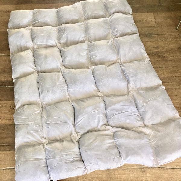Holden & Hay created a sustainable and stylish solution made with a premium, printed Italian Merino wool blend. They use recycled shredded denim that's quiet, soft, and doesn't shift with each toss and turn. The blankets are hand-stuffed and their weight with the duvet vary between 16 to 18 pounds.