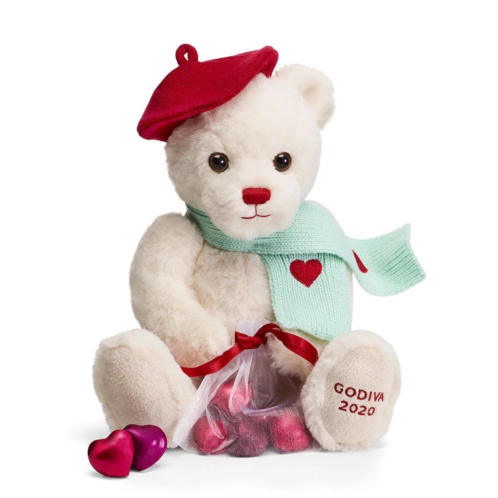 Treat your special someone to a plush Godiva teddy bear and gourmet chocolate hearts. It includes eight individually wrapped chocolate hearts, four dark chocolate in purple foil, and four milk chocolate in red foil. This adorable white bear also dons a red beret and knit scarf with heart