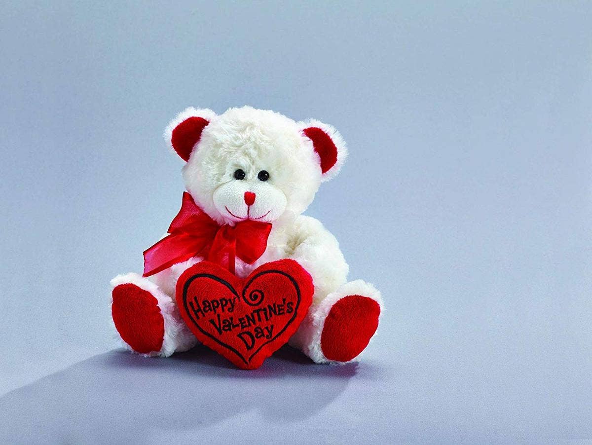 This one is a little more traditional. This white plush bear holds a red heart with black embroidered "Happy Valentine's Day," and is a classic in the best possible way.