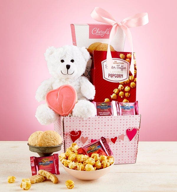 Charm your valentine with this beautiful sweets basket that comes with a bear. But it also has delights including Cheryl's Cookies, Ghirardelli Squares, Dark Chocolate Raspberry, and The Popcorn Factory Butter Toffee Popcorn.