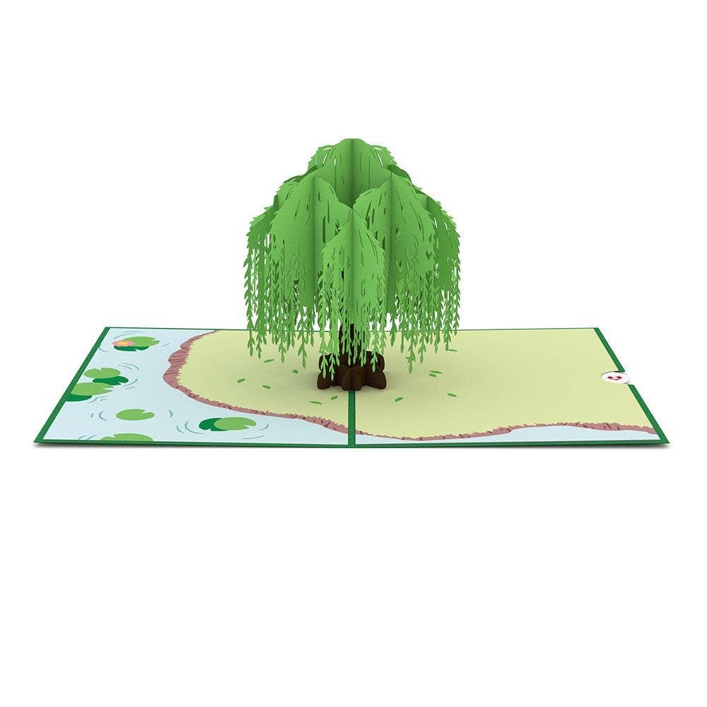 For the visually inspired, the green cover of this pop-up card features a laser-cut illustration of a beautiful silhouette of a weeping willow tree in a rolling meadow at sunset. Open the card to reveal an intricate pop up of a willow tree swaying in the wind.