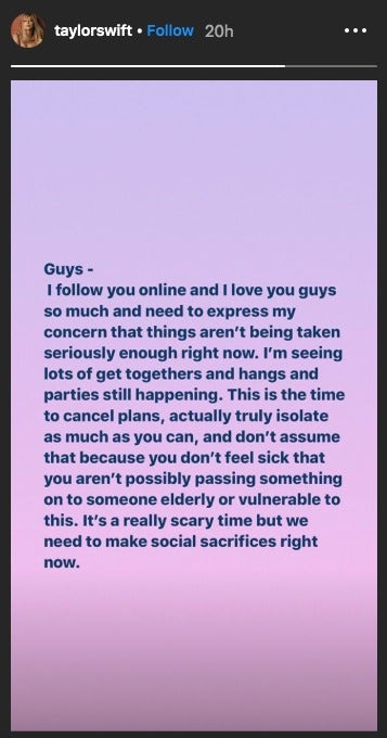 In a post on her Instagram story, Swift recognized that some of her fans she follows online seem to be going about their lives as usual, and she shared with them why they should change their behavior.