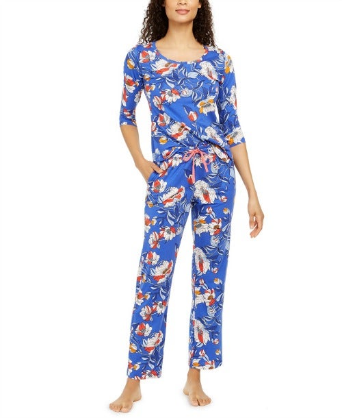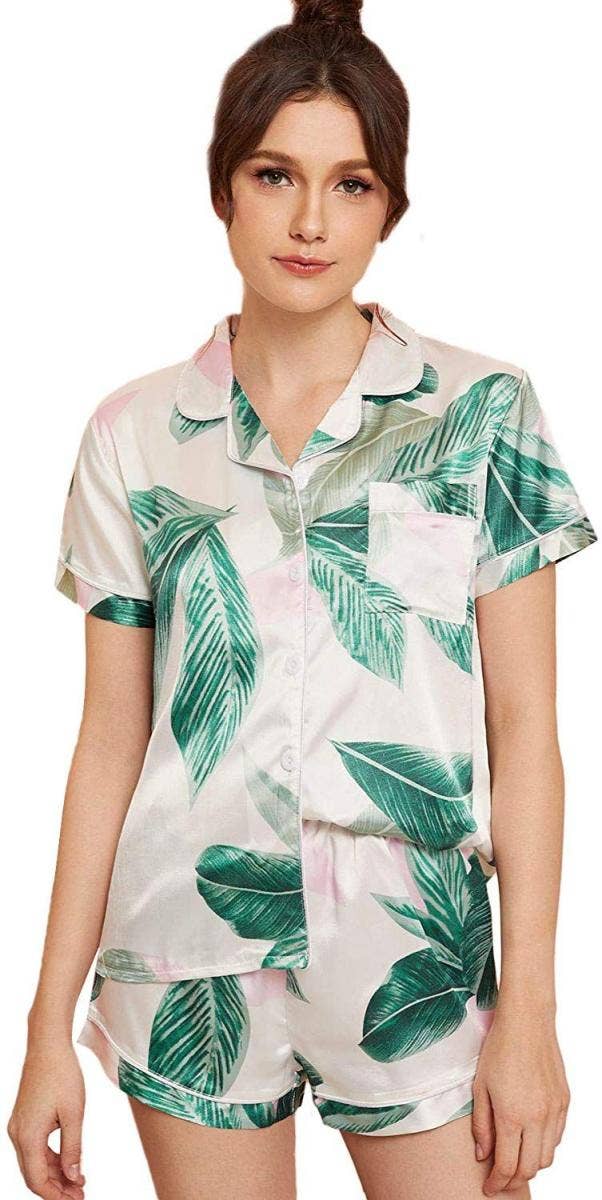This 100 percent polyester pajama set resembles satin, but for a fraction of the cost. The set has a conveniently placed pocket as well. Plus, the leaf print gives off a tropical feel, which is perfect for those summer vibes.