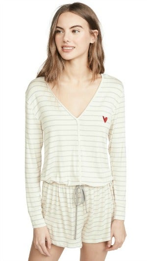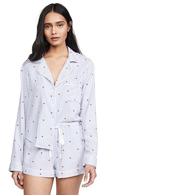 Now you can literally wear your heart on your sleeve! This striped pajama set's fabric is lightweight, the top is a collared long-sleeve button up with a pocket, and the shorts are drawstring.