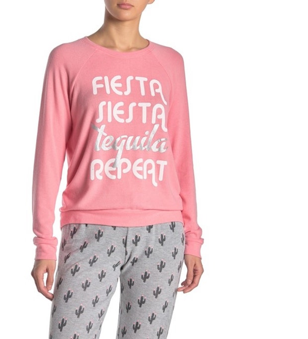 The sassy saying "fiesta, siesta, tequila, repeat" adds lots of personality to this pullover. The crew neck has a stretch knit construction, and just by the look of it, it's super comfortable to lounge around in.