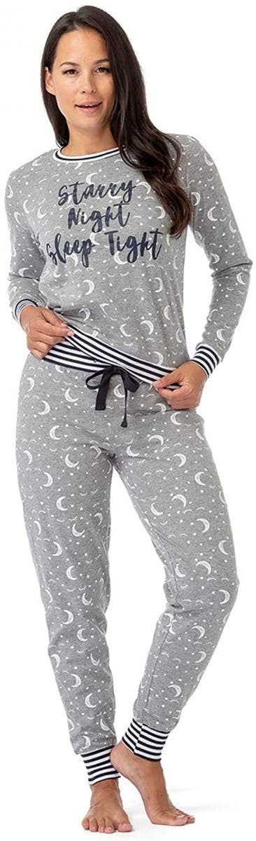These long-sleeve pajamas are lightweight, with moons and stars patterned all over, along with striped ankles and waistband. It even has the cute saying “starry night sleep tight” on the front. Adorable!