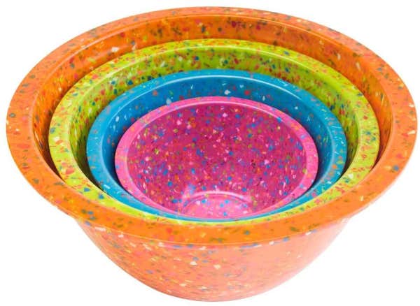 This mixing bowl set contains four different sizes (4 quarts, 2. 5 quarts, 1. 25 quarts, and 18 ounces) and make us happy just looking at them. And we could all use an extra-dose of happiness right now, right?