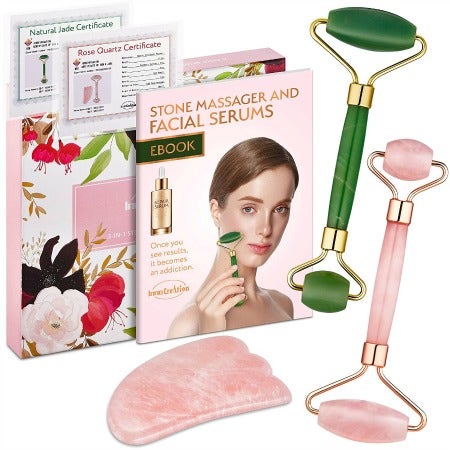 If you’re unsure about which stone is right for you, this 3-in-1 set allows you to sample both jade and rose quartz. It also comes with a gua sha if rolling isn’t for you.
