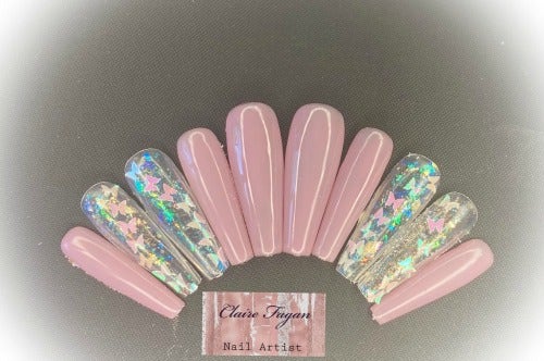 Pale pink nails with shimmery butterfly accents are so pretty and will look unlike any other manicure you've seen. That’s great for social media and those Zoom parties.
