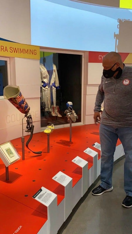 Once fitted with the proper prosthesis, he began training for track and field events for the Sydney 2000 Paralympics and won a Silver Medal in long jump and took fifth in the 100 and 200-meter races. He has donated one of his prosthetic legs to the museum.