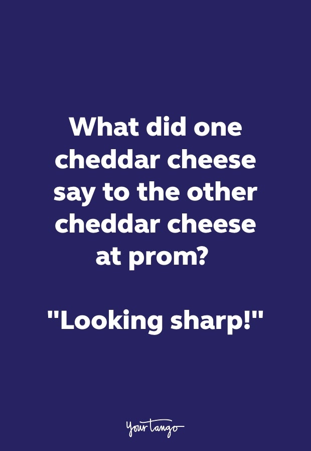 20. What did one cheddar cheese say to the other cheddar cheese at prom? “Looking sharp!”