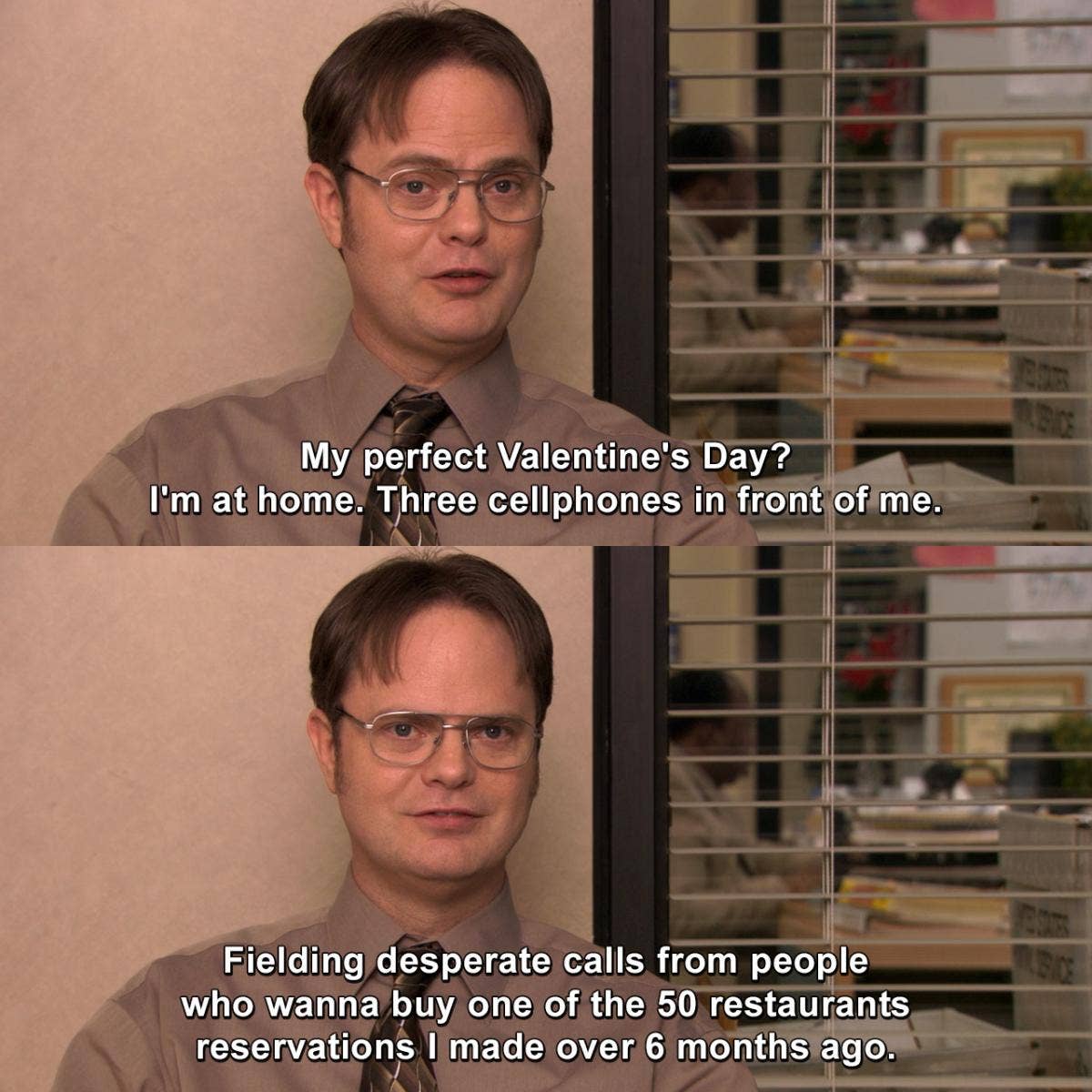 17. “My perfect Valentine’s Day? I’m at home, three cell phones in front of me, fielding desperate calls from people who want to buy one of the 50 restaurant reservations I made over six months ago.”