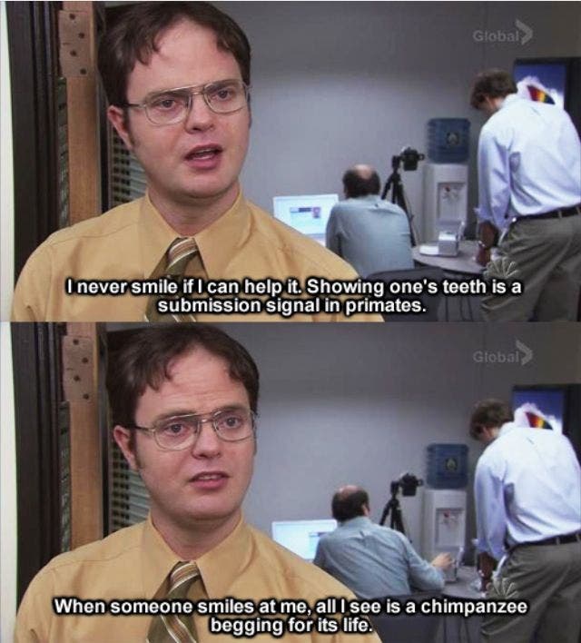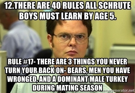 Schrute is full of random facts and recites them constantly despite social cues.